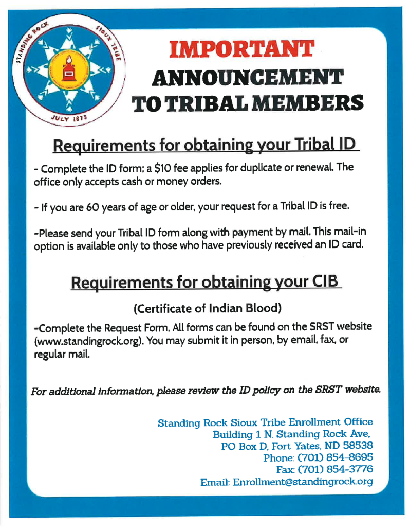 https://standingrock.org/wp-content/uploads/2026/01/Enrollment-PSA-1-pdf.jpg14081088Loren White Templehttps://www.standingrock.org/wp-content/uploads/2021/09/standingrocksiouxtribe-Crest-Logo-WHT.pngLoren White Temple2026-01-15 16:28:352026-01-15 16:28:41Requirements for obtaining Tribal ID and CIB