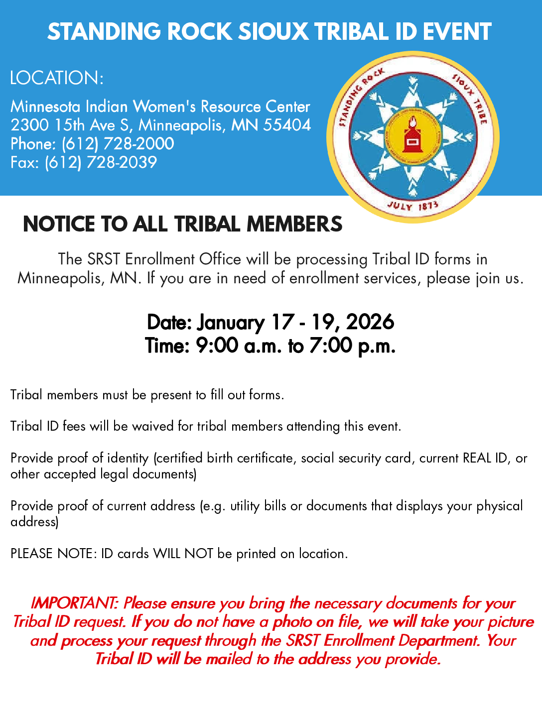 https://standingrock.org/wp-content/uploads/2026/01/SRST-MN-ID-Event-Flyer-1-pdf.jpg14081088Loren White Templehttps://www.standingrock.org/wp-content/uploads/2021/09/standingrocksiouxtribe-Crest-Logo-WHT.pngLoren White Temple2026-01-15 21:53:522026-01-15 21:53:58STANDING ROCK SIOUX TRIBAL ID EVENT