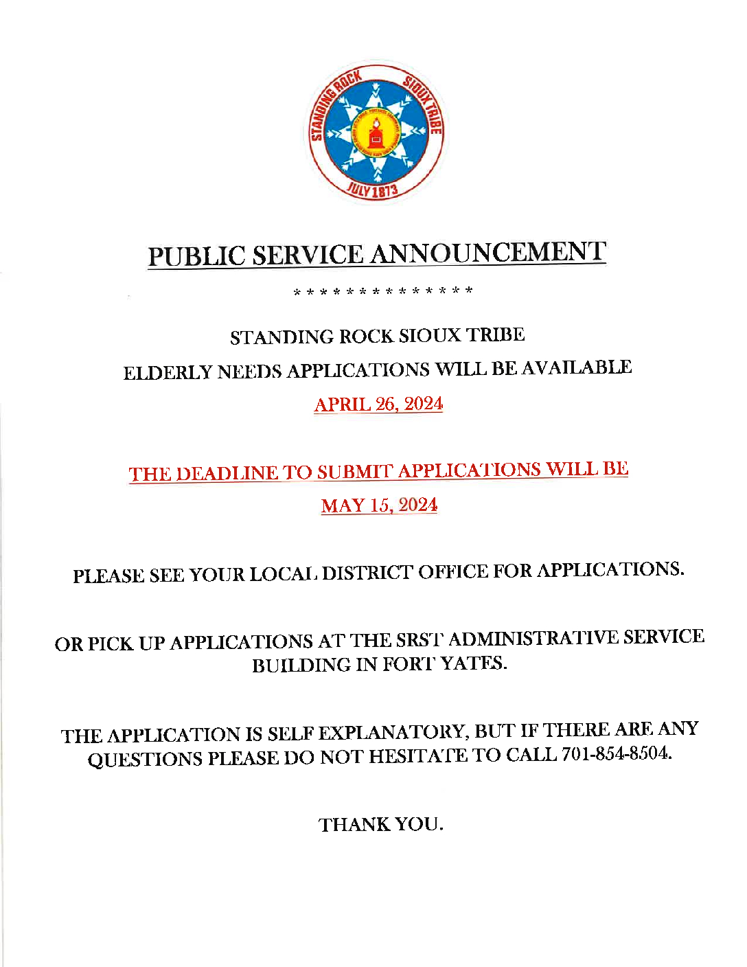 Standing Rock Sioux Tribe Elderly Needs Applications will be available April 26th, 2024