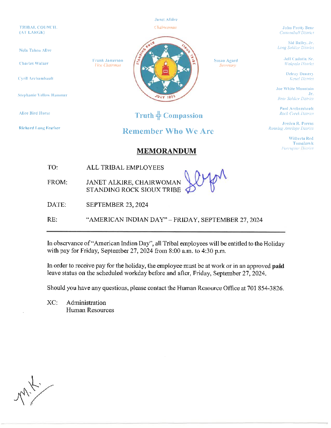 In observance of “American Indian Day”, all Tribal employees will be entitled to the Holiday with pay for Friday, September 27, 2024 from 8:00 a.m. to 4:30 p.m.