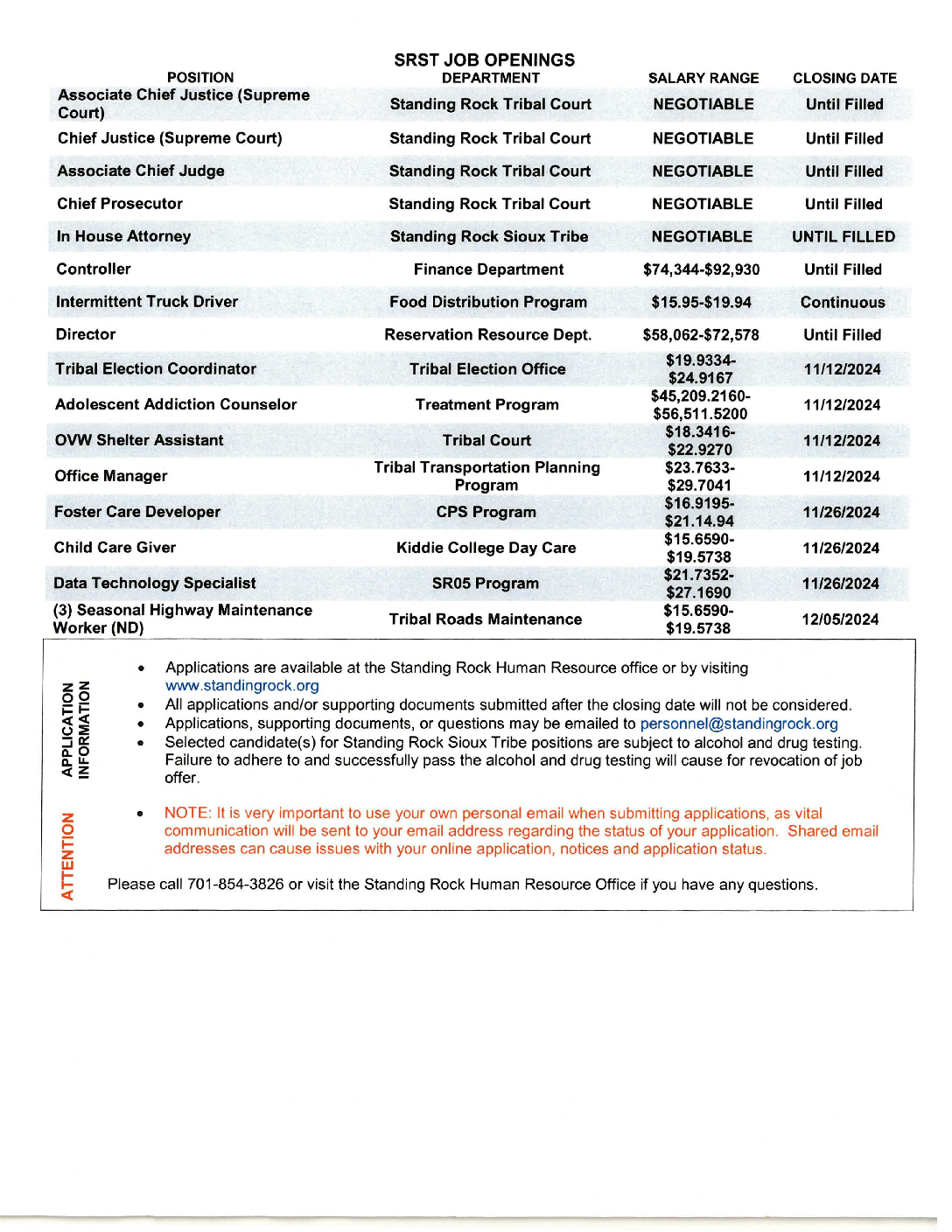 Should you have any questions place contact the Human Resource Office at personnel@standingrock.org.