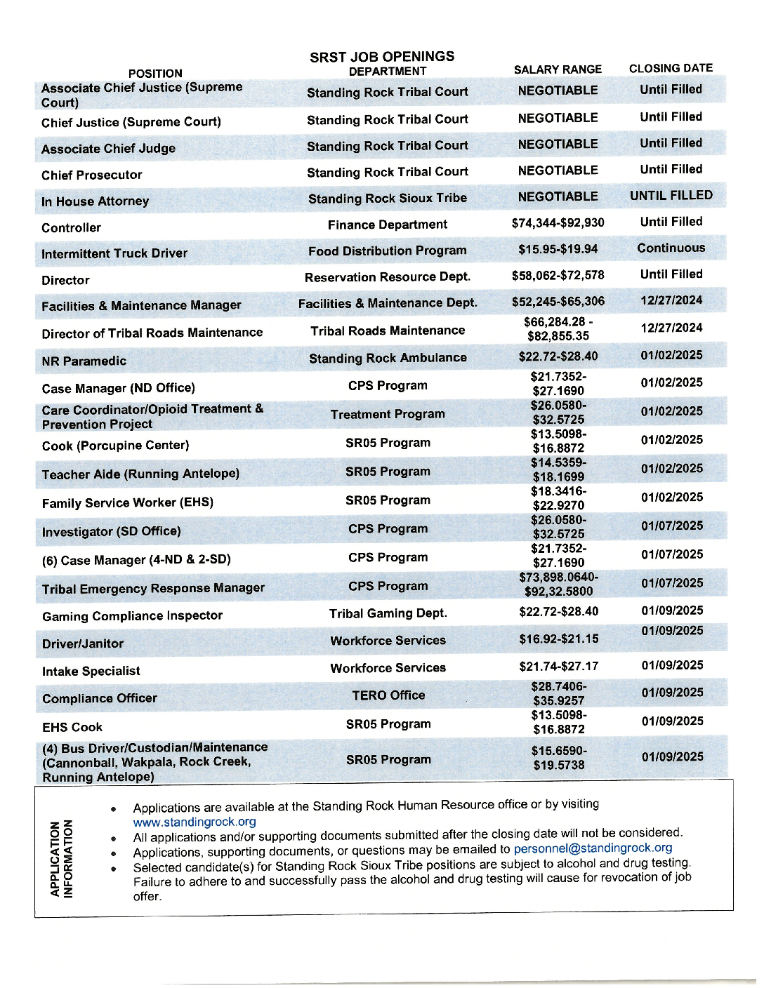 Applications are available at the Standing Rock Human Resource office or by visiting www.standingrock.org